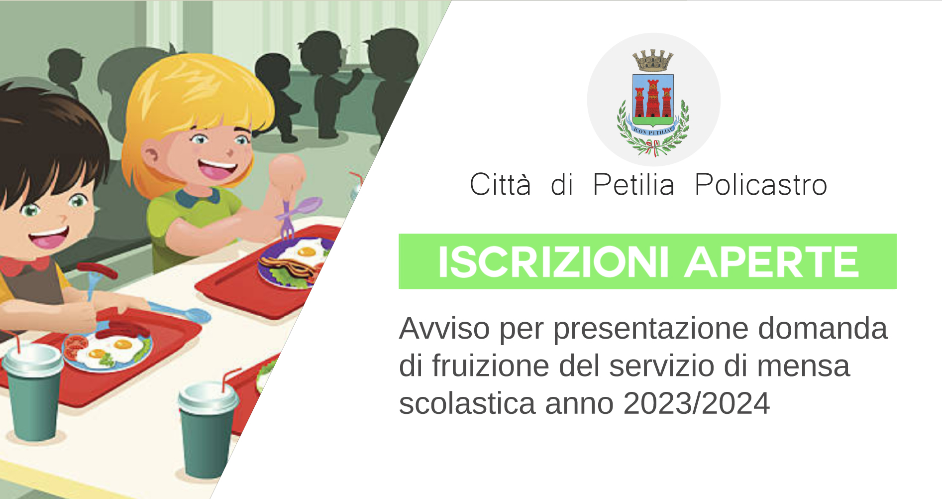Si avvisa la cittadinanza che sono aperti i termini per la presentazione della richiesta di fruizione del servizio di mensa scolastica per l'anno scolastico 2023/2024.