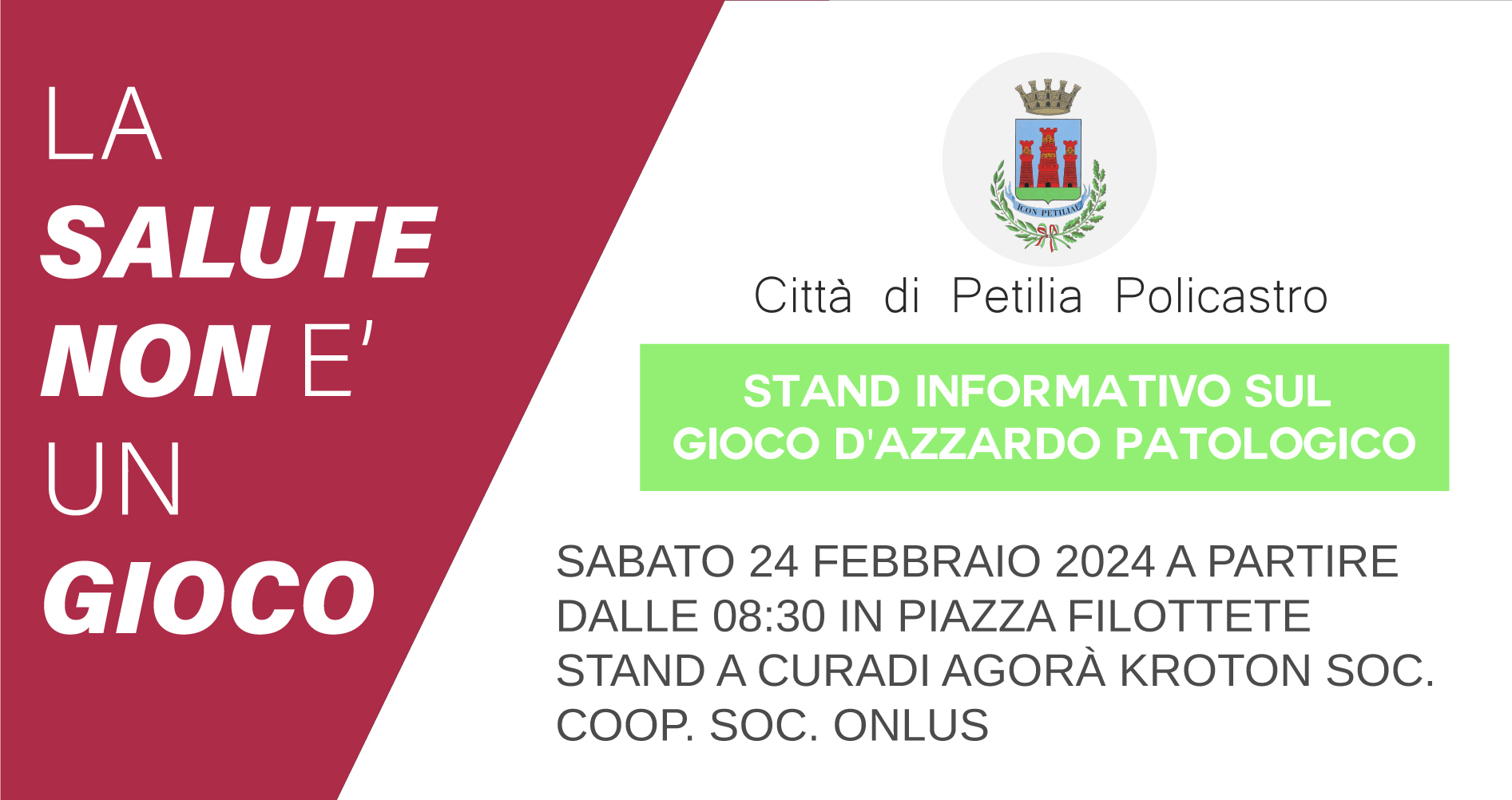 Sabato 16 Marzo 2024 dalle 08:30 in poi, in Piazza Filottete sarà allestito uno stand informativo sul Gioco d'Azzardo Patologico a cura di Agorà Kroton Soc. Coop. Soc. ONLUS.